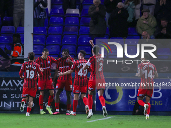 Devante Rodney of Rochdale celebrates with his teammates after scoring their third goal during the Vanarama National League match between Hartlepool United and Rochdale at Victoria Park in Hartlepool, United Kingdom, on September 24, 2024.