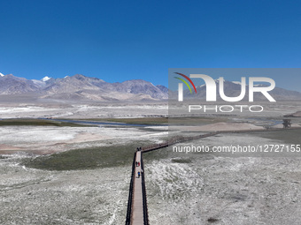 An aerial view shows the natural landscapes, including plateau wetlands, glaciers, and glacial lakes, surrounding the Muji Volcano in Aksu, Xinjiang, China, on August 25, 2025.