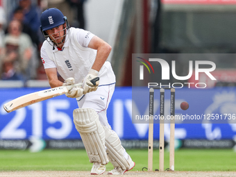 Liam Dawson of England is in action with the bat during Day 4 of the Fourth Rothesay Test match between England and India at Old Trafford in Manchester, England, on July 26, 2025.