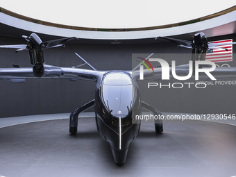 Close up at the rotor engine and the propellers of the Archer Midnight electric vertical takeoff and landing aircraft eVTOL with the futuristic design as displayed inside the exhibition hall during the Paris Air Show 2025 at Le Bourget Airport. The Archer Midnight with registration tail number N302AX, developed by California-based Archer Aviation, is designed as a piloted and four passenger air taxi aimed at reducing urban congestion through sustainable electric air mobility. The Midnight aircraft’s first test flight outside the United States took place in July 2025 at Al Bateen Executive Airport in Abu Dhabi, where it was evaluated under local environmental conditions as part of preparations for regional certification aiming to the usage of affordable air taxi transportation. Paris Air Show, one of the oldest and largest in the world aerospace events, gathers global industry leaders to showcase the latest advancements in aviation, defense, and space technology. Le Bourget, France on June 22, 2025