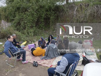 An Iranian family sit in a green area near a river (not pictured) during the day of Sizdah Bedar near the city of Astaneh-ye Ashrafiyeh in Gilan province about 346 km (214 miles) northwestern Tehran, April 2, 2023. Sizdah Bedar also known as Nature's Day is an Iranian festival held annually on the thirteenth day of Farvardin (the first month of the Iranian calendar) in which Iranians in Iran and all around the world spend time outdoors, throwing green grass into running water, to mark the end of the Nowruz (New Day) holidays in Iran.