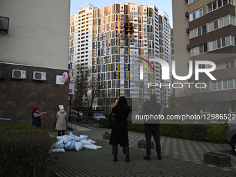 A man and a woman take pictures of an apartment block in the Dniprovskyi district damaged by a Russian drone strike in Kyiv, Ukraine, on November 14, 2025. At least four people are killed and 30 others are wounded, including children and a pregnant woman. All the injured receive medical assistance, with fifteen hospitalized. Russia launches approximately 430 drones and 19 missiles, including ballistic and aeroballistic types, targeting Ukraine, with Kyiv as the main target. The regions of Kharkiv, Odesa, Poltava, and Cherkasy are also affected.