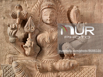 Detail of a wooden caring of Lord Vinayagar (Lord Ganesh) during the construction of a traditional Hindu wooden chariot under the guidance of a master chariot craftsman at a small workshop near the Vinayagar Hindu temple in Jaffna, Sri Lanka. This chariot will be used to carry the idol of Lord Vinayagar during the temples annual chariot festival (Ther Festival). The carvings on the chariot depict the history and miracles associated with this temple.