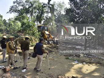 An excavator demolishes a structure during the eviction drive at Rupahi Bhakat Gaon in Nagaon District, Assam, India, on December 5, 2025.