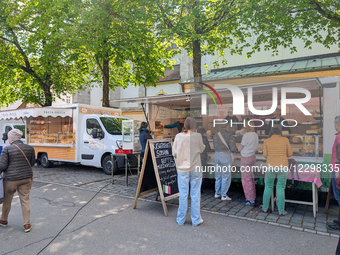 People line up at mobile market stalls to purchase Italian cheese and fresh pasta at a local outdoor market in Regensburg, Upper Palatinate, Bavaria, Germany, on April 19, 2025. Food trucks labeled ''Pasta Fresca'' and a cheese vendor from Kaswerkstatt Schomann serve regional and international specialties under the shade of spring trees.