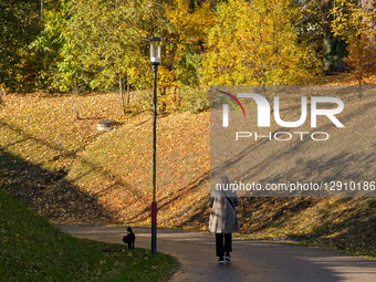 A senior woman walks a small, dark-colored dog down a paved path lined by a street lamp, with a hillside covered in vibrant orange and yellow autumn leaves in the background in Murnau am Staffelsee, Upper Bavaria, Bavaria, Germany, on October 24, 2025.