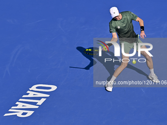 Alex De Minaur of Australia competes in his round of 16 match against Botic Van De Zandschulp of the Netherlands during the ATP Qatar ExxonMobil Open 2025 tennis tournament at the Khalifa International Tennis Complex in Doha, Qatar, on February 19, 2025.