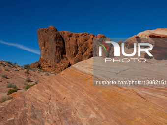 Rock formations are in the Valley of Fire in the Mojave Desert in Nevada, USA.