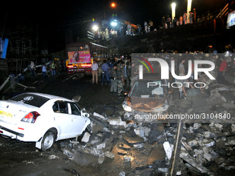 Indian rescue teams and onlookers stand on the rubble and atop Majerhat bridge after a segment of the bridge suddenty collapsed on September 04,2018 in Kolkata in India. ( One person was killed, 24 were injured and they have been shifted to the hospital. Photo by Debajyoti Chakraborty/NurPhoto)