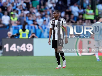 Pierre Kalulu of Juventus FC leaves the pitch receiving a red card during the Serie A Enilive match between SS Lazio and Juventus FC at Stadio Olimpico on May 10, 2025 in Rome, Italy.