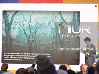 KRAKOW, POLAND - APRIL 04, 2023: Simon Rein, Google Arts and Culture Senior Program Manager, speaks at the 'Kraków-wow' exhibition opening on Google Arts and Culture platform, at the Princes Czartoryski Museum, on April 04, 2023, in Krakow, Poland. Experience the charm of Kraków like never before with "Kraków-wow" - the first-ever Polish online collection showcasing the city's rich cultural heritage. Created in collaboration with 13 renowned cultural institutions, Google Arts and Culture brings you an immersive virtual tour of the UNESCO-listed city, taking you on a journey through the glorious past of the former capital of Poland.