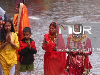 Nepali Hindu devotees perform rituals at Gaurighat riverbank in Kathmandu, Nepal, on October 27, 2025. Chhath, a festival of benediction to Lord Surya, the sun, starts on the day of Karthik Shukla Chathurthi and ends on Shukla Saptami according to the lunar calendar. Thekuwa, Khajuri, and Kasar, along with varieties of dry fruits, fruits, and flowers, constitute the basket popularly known as ''Dhakri.'' Devotees fast and worship the sun for the long lives and well-being of their family members, also praying for their expectations and attempts to come true. Chhath is celebrated by all the members of the family. The Hindu religion adores and respects Lord Sun, who at the time of Chhath is also called ''Chatti Mata'' or the goddess of Chhath.