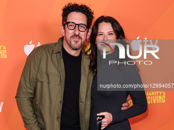 American actor and entrepreneur Adam Shapiro and his wife, American actress and theater director Katie Lowes, arrive at Hilarity For Charity's Friendsgiving 2025 held at Rolling Greens DTLA in Los Angeles, California, United States, on November 15, 2025.