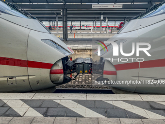 A close-up of two coupled ICE trains at Frankfurt am Main Central Station in Frankfurt, Germany, on March 30, 2023, showcases Germany's advanced high-speed rail connections. Frankfurt, a major European hub, facilitates seamless connections between cities. The platform and station design complement the sleek, aerodynamic structure of the trains, illustrating public transit.