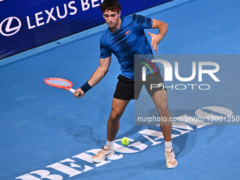 Alexander Donski of Bulgaria competes during the round of 32 at the ATP Challenger ''Trofeo Faip-Perrel'' 2025 at Choruslife Arena in Bergamo, Italy, on November 18, 2025.