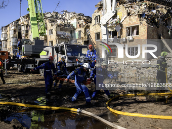 Rescuers carry the body of a victim after a missile strike on a residential high-rise building. At least 10 people die in a Russian overnight attack that includes 598 Shahed drones, 2 Kh-47M2 Kinzhal aeroballistic missiles, 9 Iskander-M/KN-23 ballistic missiles, and 20 Kh-101 cruise missiles. Among the dead are three children, the youngest a three-year-old girl. Rescue and search operations continue in Kyiv, Ukraine, on August 28, 2025.