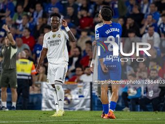 Vinicius Junior of Real Madrid argues with Juan Iglesias of Getafe CF during the LaLiga EA Sports football match between Getafe CF and Real Madrid CF at Coliseum Alfonso Perez in Getafe, Spain, on October 19, 2025.