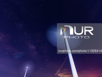 A wind turbine is seen under the starry sky over Mountain Kuocang in Taizhou, Zhejiang province, China, on July 19, 2017.