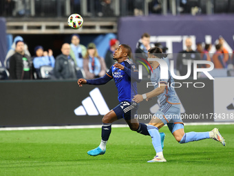 FC Cincinnati forward Sergio Santos #17 and New York City FC midfielder Justin Haak #80 pursue a loose ball during action in Game 2 of the Audi 2024 MLS Cup Playoffs at Citi Field in Corona, Queens, N.Y., on November 2, 2024.