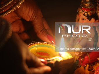 A Hindu devotee holds a diya (small decorative clay lamp) by idols of Goddess Lakshmi and Lord Ganesh during the festival of Diwali at a Hindu temple in Toronto, Ontario, Canada, on October 20, 2025.