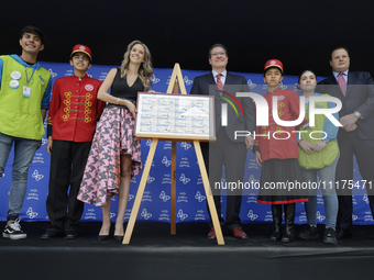 Alejandra Cervantes Mascareno, the director of the Papalote Children's Museum, is posing with a girl and boy singers from the National Lottery during the presentation of commemorative tickets for the 30th Anniversary of the Papalote Children's Museum in Mexico City.