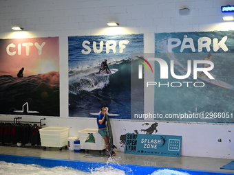 Surfer Clea Gruber takes second place in the women's category of the first international indoor surfing competition in Lyon, France, on November 8, 2025.