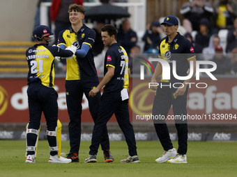 Durham's Nathan Sowter is celebrating with his teammates after bowling Leicestershire Foxes' Rish Patel for 48 during the Vitality T20 Blast match between Durham and Leicestershire Foxes at the Seat Unique Riverside in Chester le Street, England, on June 12, 2024.