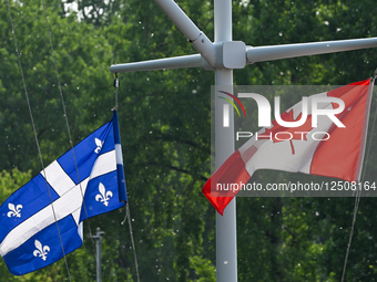 LONGUEUIL, CANADA - June 6: Canadian and Quebec flags fly at Longueuil Harbor, in Longueuil, Quebec, Canada, on June 6, 2025.