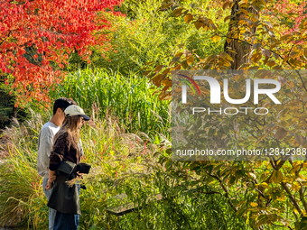 A young couple stands surrounded by colorful autumn foliage in a park in Munich, Bavaria, Germany, on October 8, 2025.