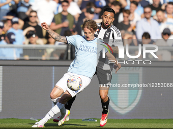 Nicolo Rovella defensive midfield of Lazio and Italy and Nico Gonzalez right winger of Juventus and Argentina compete for the ball during the Serie A match between Lazio and Juventus at Stadio Olimpico on May 11, 2025 in Rome, Italy.