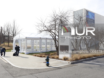 Workers and technicians prepare outside the theater at the Kennedy Center in Washington, D.C., on December 4, 2025, where preparations are finalized for the 2026 FIFA World Cup draw.