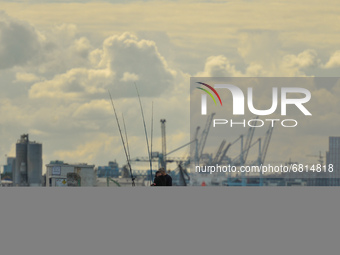 Two fisherman chatting on the Great South Wall, in Poolberg, Dublin. On Thursday, 17 June 2021, in Dublin, Ireland.