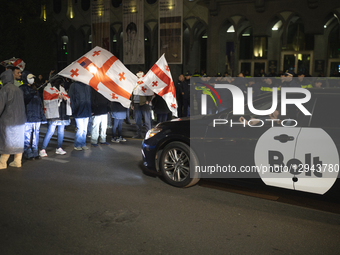On October 31, 2025, in Tbilisi, Georgia, protesters attempt to block Rustaveli Avenue during a demonstration demanding the release of political prisoners and new elections. Police clear the road and reopen it to traffic after about 30 minutes, and later that evening arrest at least two people for obstructing the road.