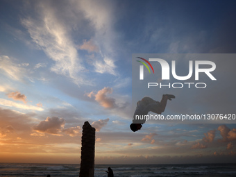 Palestinians spend their time on the Mediterranean coast during sunset in Gaza City, on December 8, 2025.