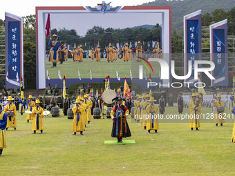 A joint civilian-military traditional music band performs during a media day event marking the 77th Armed Forces Day in Gyeryong, South Chungcheong Province, South Korea, on September 29, 2025.