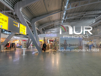 Eindhoven Airport in North Brabant, The Netherlands. Eindhoven Airport EIN / EHEH is a public civilian and military airport, the second largest Dutch airport in passenger traffic. The airport is hub for Transavia airlines, a KLM subsidiary low cost airline and many budget and charter airlines operate on a scheduled basis flights and charter such as Ryanair, Wizz Air, TUI, SunExpress, Pobeda, Pegasus Airlines, Lauda, Corendon and Freebird airlines. Images show the Terminal, the check-in and self check in hall, passengers boarding, hotel, airplanes, apron, the observation desk, general interior and exterior view.