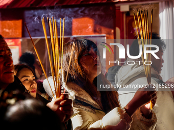 Chinese Buddhists offer prayers on the first day of the Lunar New Year of the Snake (Spring Festival) at a Chinese Buddhist monastery in Toronto, Ontario, Canada, on January 29, 2025. The Chinese lunar calendar assigns an animal symbol to each year in a 12-year cycle. According to the zodiac, 2025 is the Year of the Snake.
