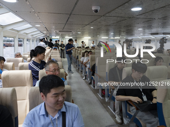 Passengers selected through advance reservations take a trial ride aboard the Han River Bus after departing from Yeouido Pier in Yeongdeungpo District, Seoul, South Korea, on July 1, 2025. The city's first eco-friendly water transit system operates with electric and hybrid diesel-electric vessels, traveling a 31.5-kilometer route that connects seven piers--Magok, Mangwon, Yeouido, Oksu, Apgujeong, Ttukseom, and Jamsil. With a capacity of up to 199 passengers, the service is scheduled for official launch in September, with public trial rides available every Tuesday, Thursday, and Saturday through August 30.