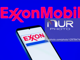 The ExxonMobil logo is displayed on a mobile phone with the company branding seen in the background in this photo illustration in Brussels, Belgium, on November 11, 2025.