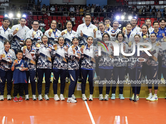 Thailand's players show their gold medals and pose for photographs after winning the women's volleyball final match of the 33rd Sea Games at Huamark Indoor Stadium in Bangkok, Thailand, on December 15, 2025.