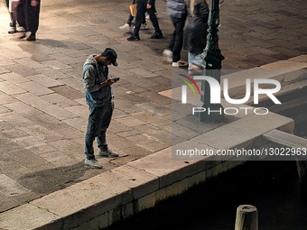 A young man stands on a paved sidewalk, looking down intently at his mobile phone near the edge of a canal at night in Venice, Italy, on November 15, 2025. The man wears a denim jacket, dark pants, and a baseball cap. His focus on the handheld device highlights digital communication and technology use in the historic urban environment. Other pedestrians are visible passing.