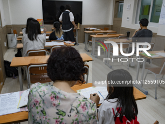 Instructors teach children as part of an educational program at Hope365, a support center for overseas Koreans, in Ansan, South Korea, on July 16, 2025. Hope365, one of 23 centers nationwide, offers free services to help overseas Koreans settle in South Korea, including academic education in 18 languages, cultural training, and guidance on local norms and customs. The center also provides free shelter and meals for those in need and offers customized programs tailored to individuals' reasons for coming to Korea, such as employment or study.