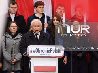 Jaroslaw Kaczynski, leader of the largest opposition PiS (Law and Justice) party, speaks to the crowd as he takes part in a rally against immigration and Mercosur in Warsaw, Poland, on October 11, 2025. Hundreds of people take part in a rally against the European Union's (EU) Pact on Migration and Asylum and the EU-Mercosur deal. The rally, organized by the right-wing populist and national-conservative PiS (Law and Justice) party, sees the participation of the political group The Border Defence Movement (Ruch Obrony Granic; ROG), founded and led by the Polish nationalist Robert Bakiewicz.