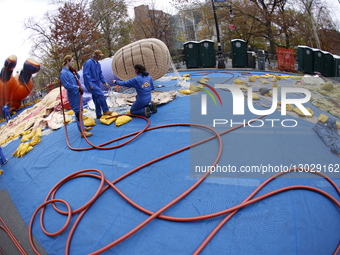 More than 5,000 volunteers gather on Manhattan's Upper West Side in New York City, United States, on November 25, 2025, to inflate giant helium balloons for the 99th Macy's Thanksgiving Day Parade. Along 77th and 81st Streets, in front of the American Museum of Natural History, teams inspect seams, check pressure, and ensure stability. Visitors arrive early to watch the colorful giants come to life, marking the official start of Thanksgiving in New York City.