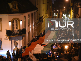 Protesters march in Budapest, Hungary, on December 1, to the Prime Minister's office. The protesters gather at the call of the Mayor of Budapest, demanding that the city's taxes be lowered and more government funding be provided.