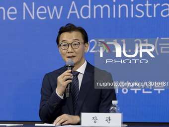 Jeon Jae-soo, South Korea's Minister of Oceans and Fisheries, delivers a policy briefing at the KOSIS Center multipurpose hall on the 10th floor of the Korea Press Center in Seoul, South Korea, on November 21, 2025, detailing the new administration's maritime priorities, including the ministry's planned relocation to Busan and initiatives to develop the Northern Sea Route.
