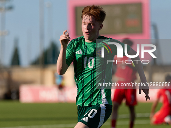 Braiden Graham of Northern Ireland celebrates scoring the 1-0 goal with teammates during the 2025/26 UEFA European Under-19 Championship qualifying round group 13 soccer match between Northern Ireland and Azerbaijan at the Centenary Stadium in Ta Qali, Malta, on November 15, 2025.