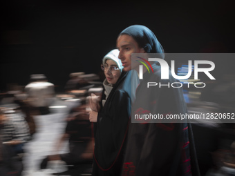 Two Iranian actresses stand outside the Blackbox theater hall after performing in an interactive performance, The 257, in Iran Mall mega-complex, situated in Tehran's most western 22nd district, Iran, on October 1, 2025. The interactive performance ''257'' with an audience-centered approach attempts to create an internal dialectic between the actor and the audience. This performance confronts the audience with itself before any other subject, whether it be excitement or storytelling.