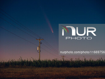 Comet C/2023 A3 (Tsuchinshan-ATLAS) is visible to the naked eye for the first time in 80,000 years and lights up the night sky over Monroe, Wisconsin, on October 15, 2024, just after sunset.