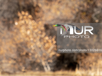 A mallard duck flies over Bosque del Apache National Wildlife Refuge near San Antonio, New Mexico. The refuge's wetlands serve as a critical resting and feeding stop for thousands of cranes, geese, and other migratory birds moving along the Rio Grande corridor. Wildlife watchers and photographers gather each year to witness the spectacle as the birds arrive in the early morning light and settle in for the winter season.